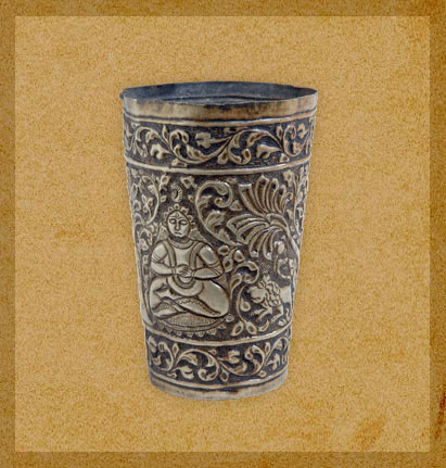 An intricately engraved glass showing scens from the Ramanaya. Used for serving water. Height 12 cm., Diameter 8.5 cm., Weight 0.18 Kg.
