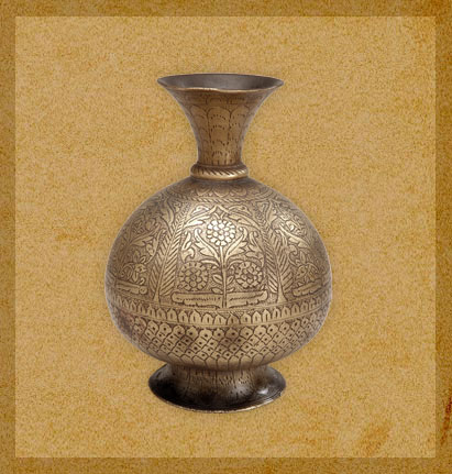 Used for carrying holy water from the river Ganga . Here the vessel with its long neck is more like surahi, a shape influenced by the Central Asian traditions. Height 11.8 cm., Diameter 14 cm., Weight 3.4 Kg.
