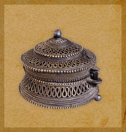 The decorative metal box with perforated design is cast in the dhokra or lost wax technique. The perforated design helps to circulate air and keeps the pan leaves fresh. Height 8 cm., Diameter 10 cm., Weight 0.34 Kg.