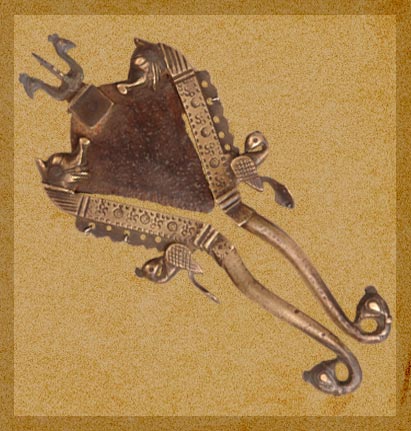 The sharp iron blade is fitted with bronze levers on both sides for cutting. On reversal of the levers the triangular blade becomes a dagger. Height 18.5 cm., Width 8 cm., Weight 0.29 Kg.